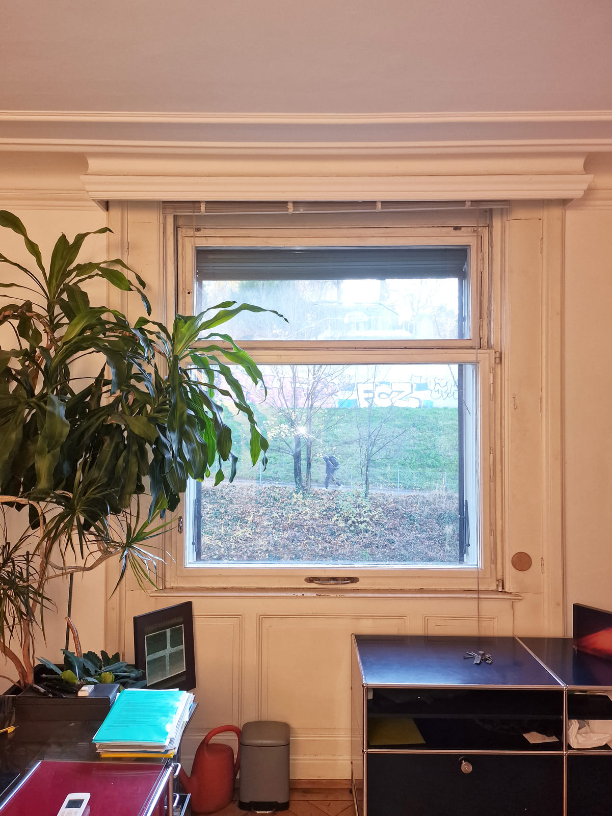 Die Montage der neuen Elemente erfolgte bewusst in derselben leichten Schräglage wie der Bestand – damit das Fassadenbild unverändert bleibt. Oberflächen wurden mit ölbasierten Grundierungen behandelt und gemäss historischem Befund ergänzt. Die Retuschen und die Fassung der neuen Fenster mit klassischer Ölfarbe übernahm die Christian Schmidt Malermeister AG in Abstimmung mit unserer Restaurationsarbeit. Das Unternehmen ist – wie wir – Partner im Netzwerk Altbauweise Zürich, einem Zusammenschluss spezialisierter Handwerksbetriebe für historische Bausubstanz.