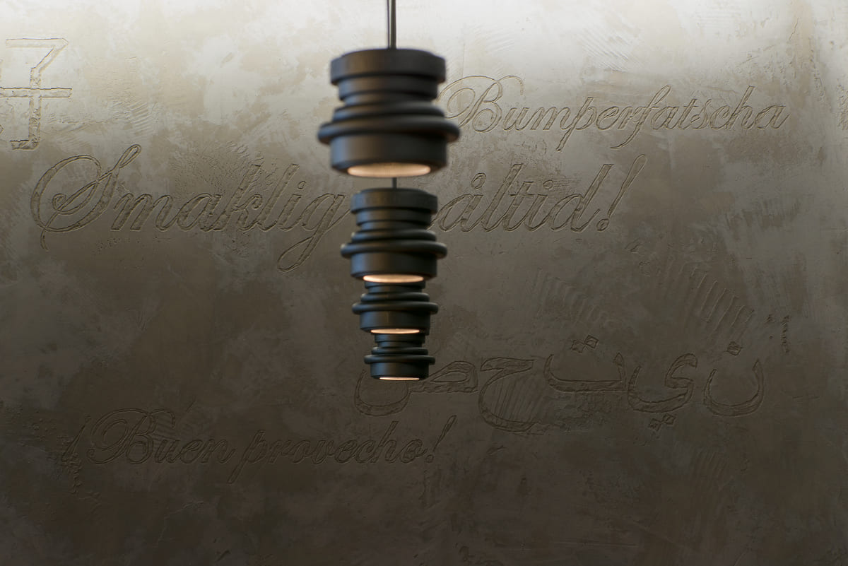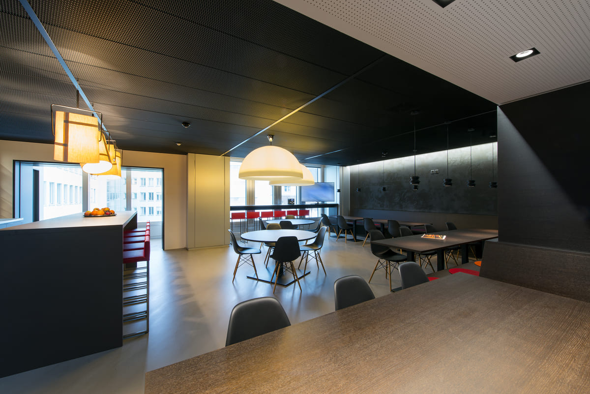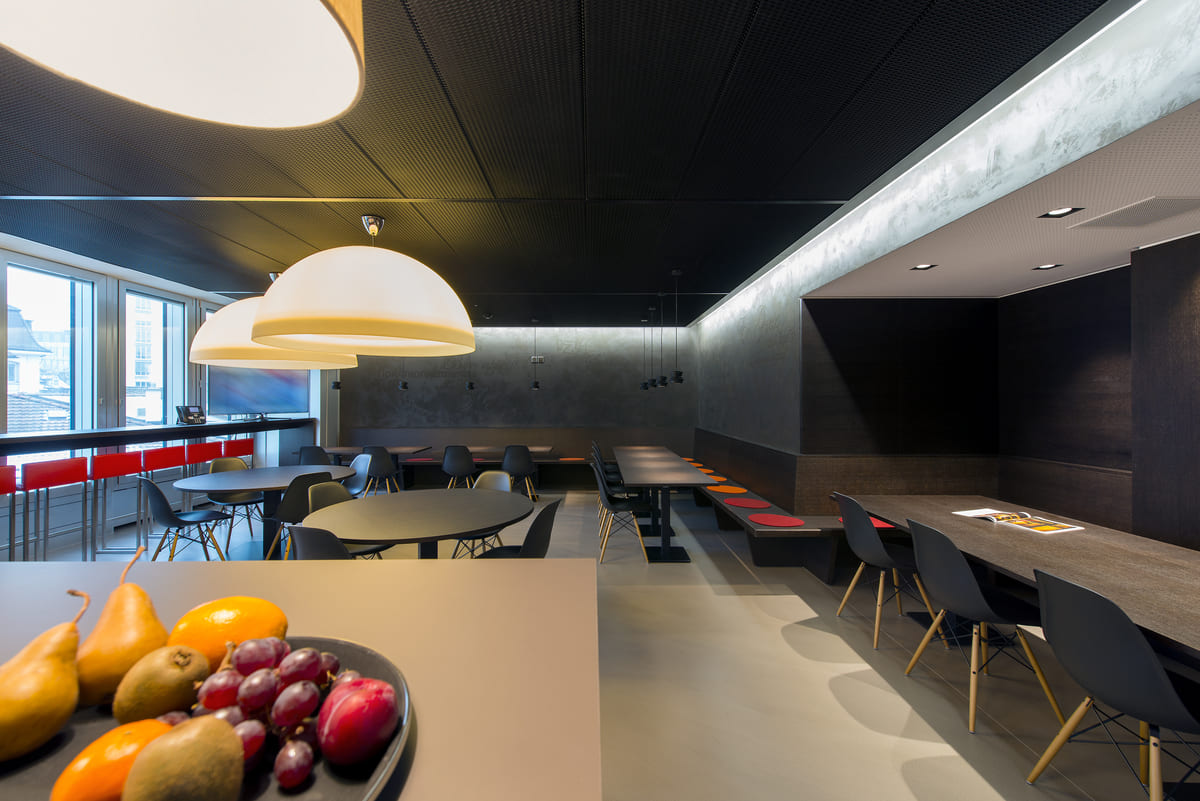 Der Empfangskorpus markiert den Einstieg: schlicht, robust und passgenau. Postfächer, Küchen, Side- und Highboards ziehen sich wie ein roter Faden durch die Etagen. In der Cafeteria haben wir eine Sitzbank samt eleganter Wandverkleidung umgesetzt. Wer genau hinschaut, entdeckt an der Wand mehr als nur Design und vielleicht auch die eine oder andere Sprache.
