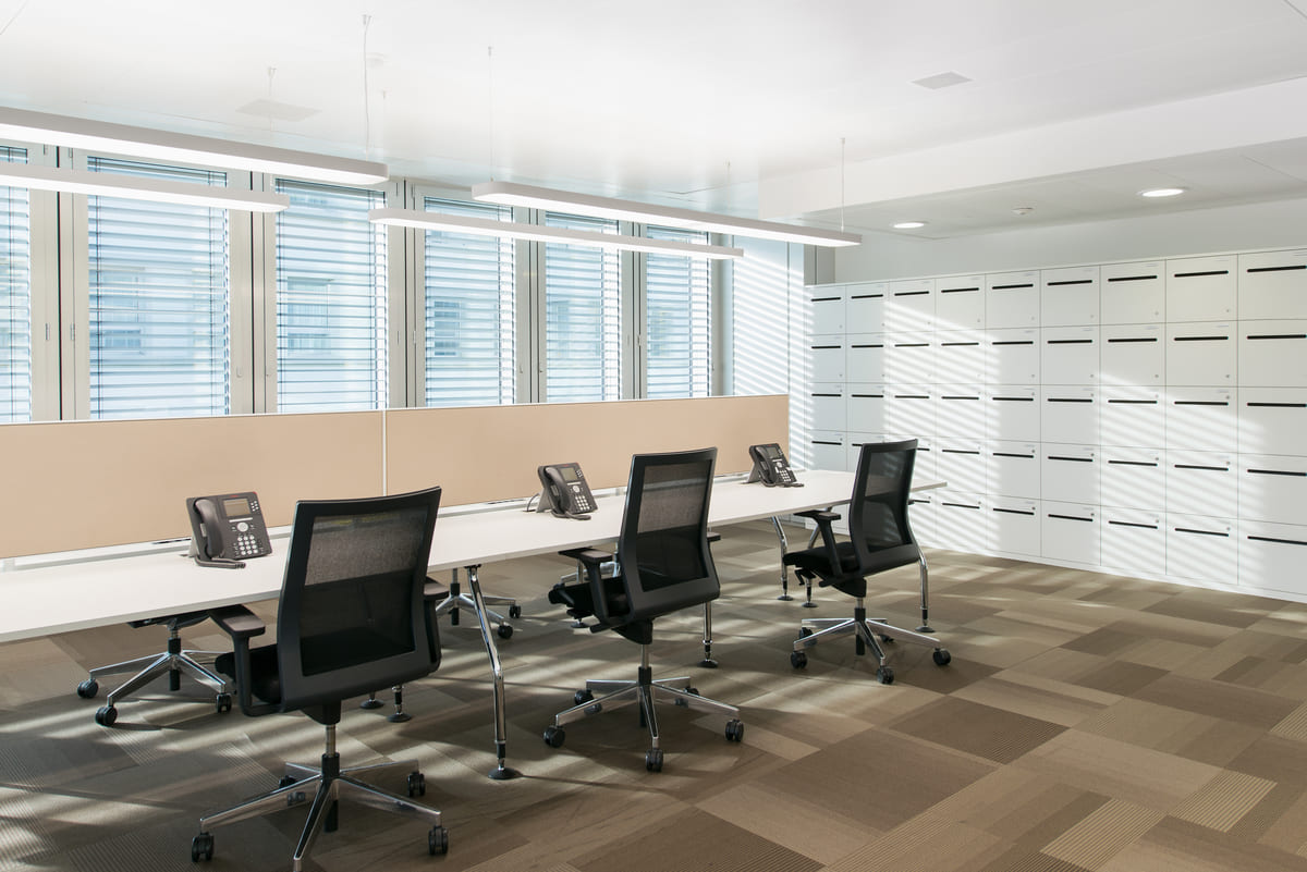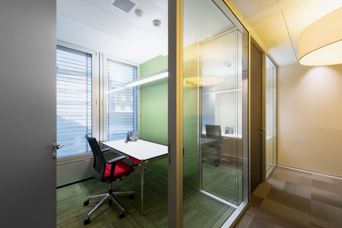 Für ruhige Gespräche und konzentriertes Arbeiten entstanden eine Telefonkabine und eine Monk Cell, akustisch abgeschirmt und fein in die Umgebung integriert. Wir fertigten quadratische, runde und rechteckige Tische, die an die jeweiligen Meetingräume angepasst sind. Die akustischen Elemente sorgen dabei für gedämpfte Räume, in denen sich Gespräche klar entfalten können.