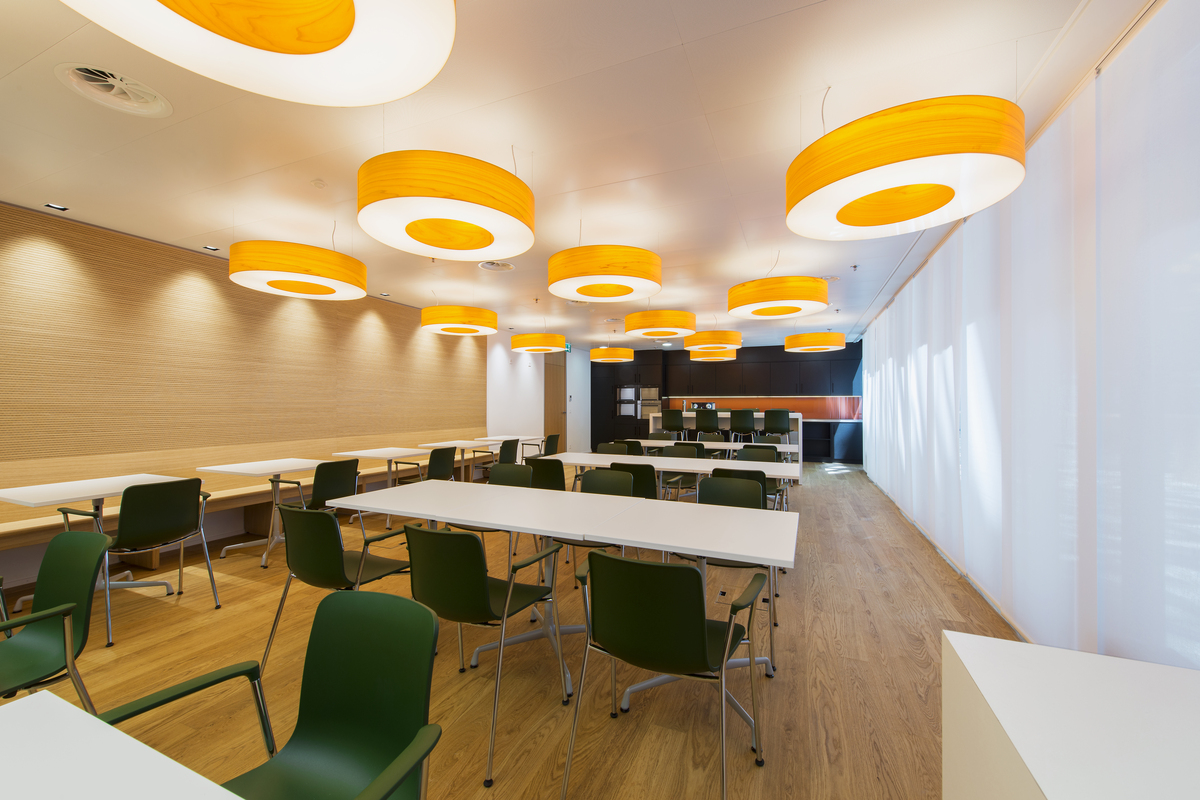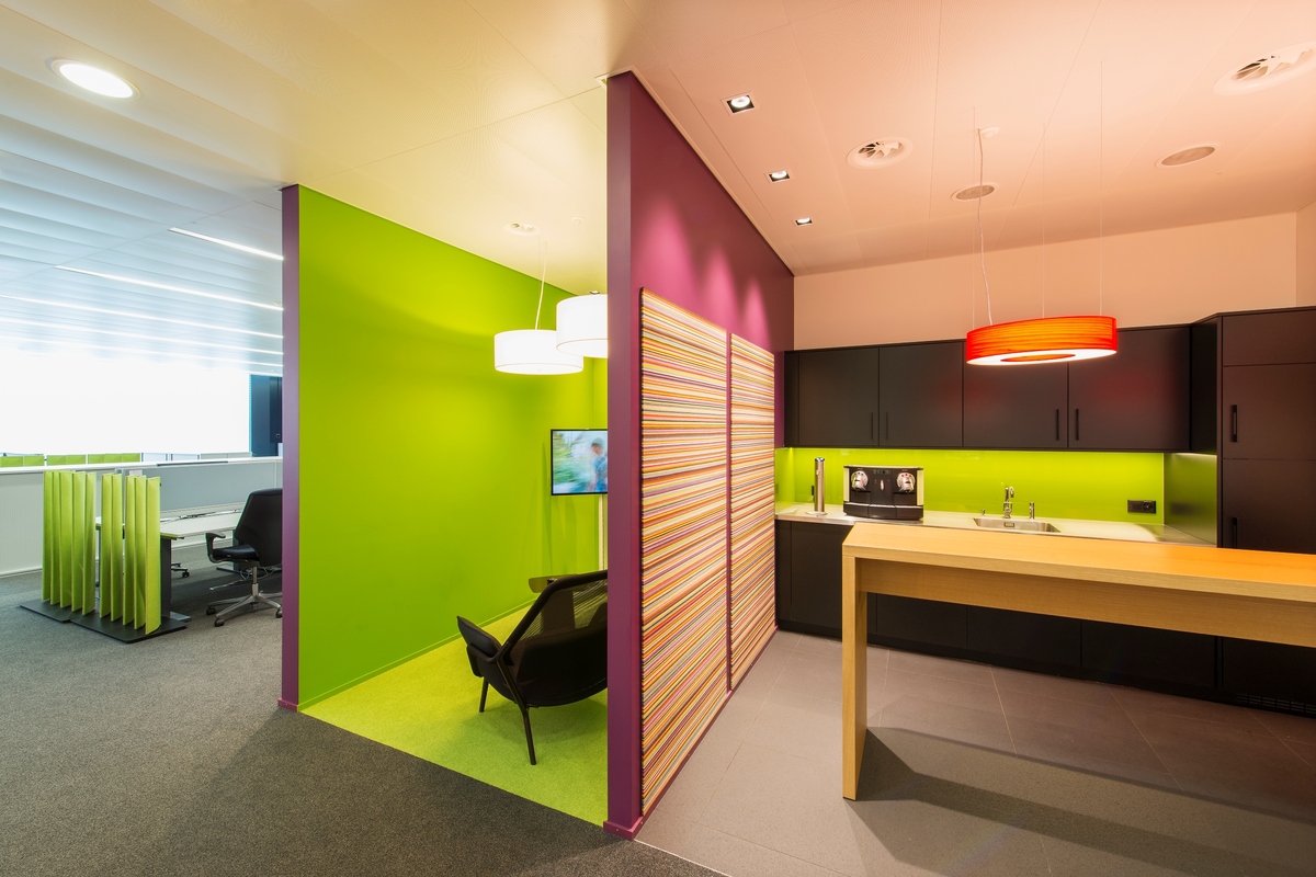 Für kurze Besprechungen und gemütliche Pausen stehen Teeküchen, Stehtische und Theken aus Holz und Kunstharz sowie eine Cafeteria mit einer durchgehenden Sitzbank bereit. Raumtrenner aus Eiche und Pflanzentöpfe strukturieren die Arbeitsplätze und schaffen ruhige Zone.