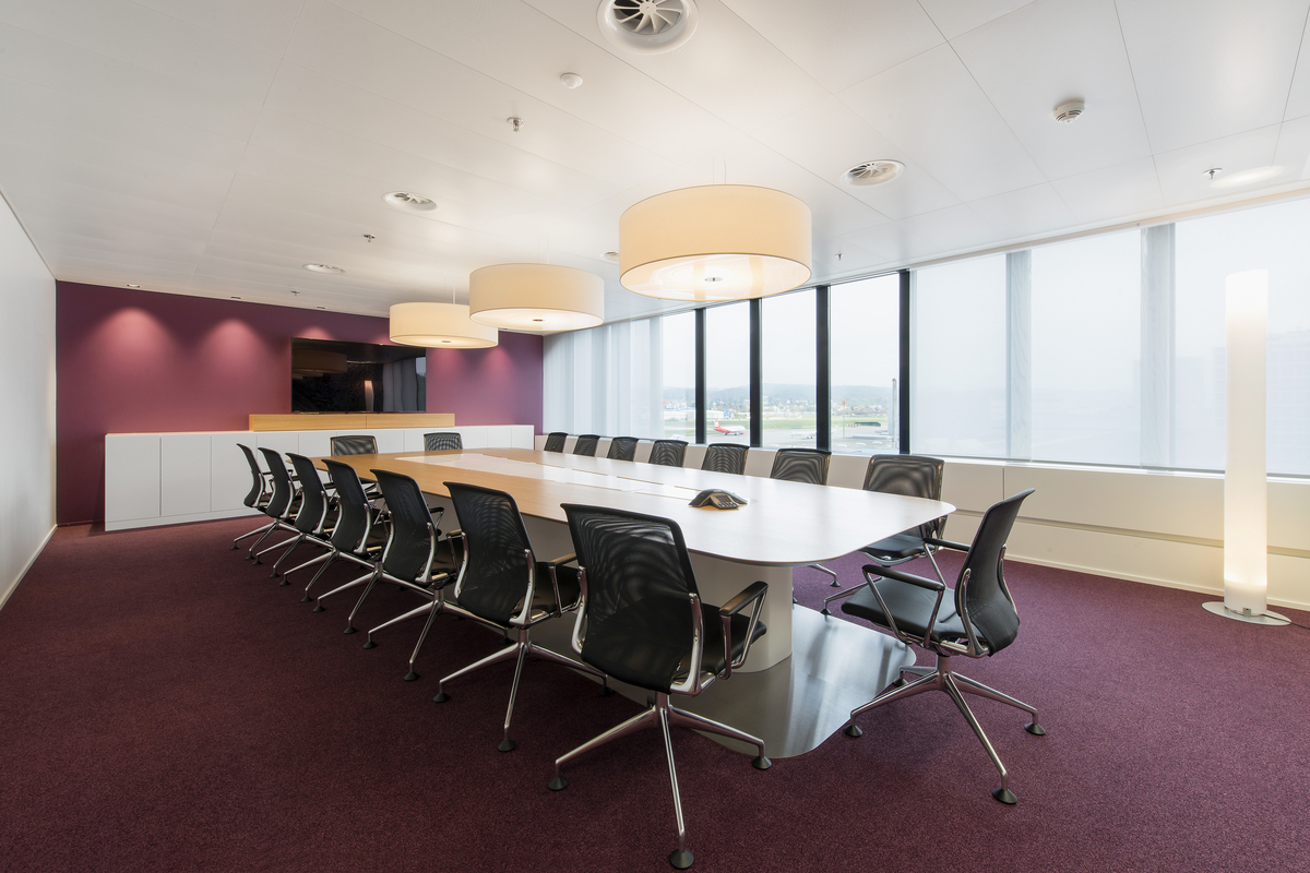 Das Herzstück des Meetingraums ist der robuste Tisch aus Eichenfurnier. Seine Mitte besteht aus einem HIMACS-Einsatz, in dem die Technikbox versenkt ist. Der ebenfalls aus HIMACS gefertigte Fuss steht auf einer CNS-Bodenplatte und sorgt für Stabilität und Beinfreiheit. Ergänzend dazu entstand ein passendes Sideboard.